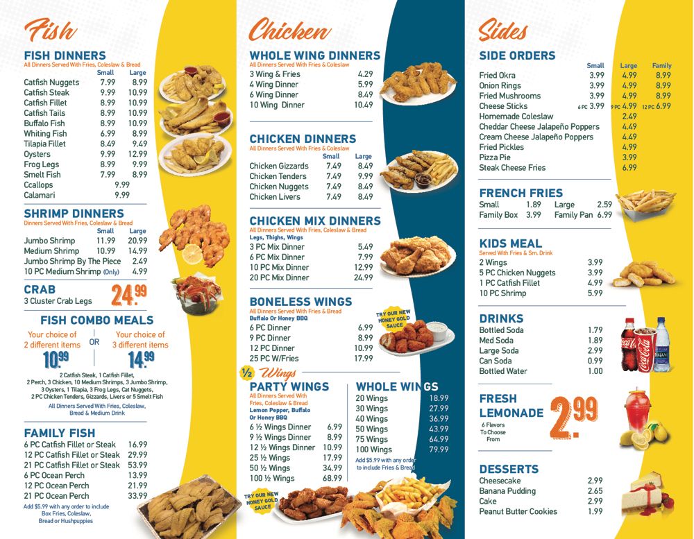 Choices 2 catfish steaks, 1 catfish fillet, 2 perch, 3 chicken wings, 10 medium shrimp, 3 jumbo shrimp, 3 oysters, 1 tilapia, 3 frog legs, cat nuggets, 2 pieces chicken tenders, gizzards, livers, or 5 smelt fish.